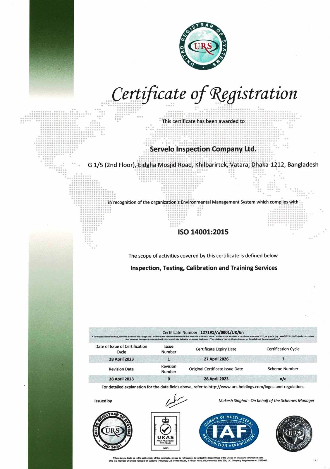 Servelo Ins. Co. Ltd. takes pride in holding the ISO 14001 Certification, which demonstrates our commitment to effective environmental management practices. This internationally recognized standard highlights our dedication to minimizing environmental impact and promoting sustainability within our operations. Click the button below to view or download our ISO 14001 certificate for more information.